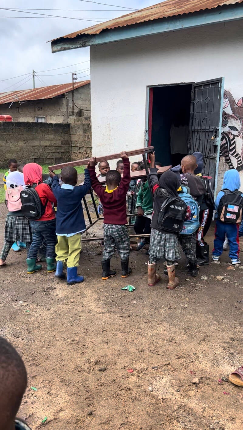 This year, we have experienced flooding 5 times, so the children had to move all the furniture out to clean our muddy classrooms.